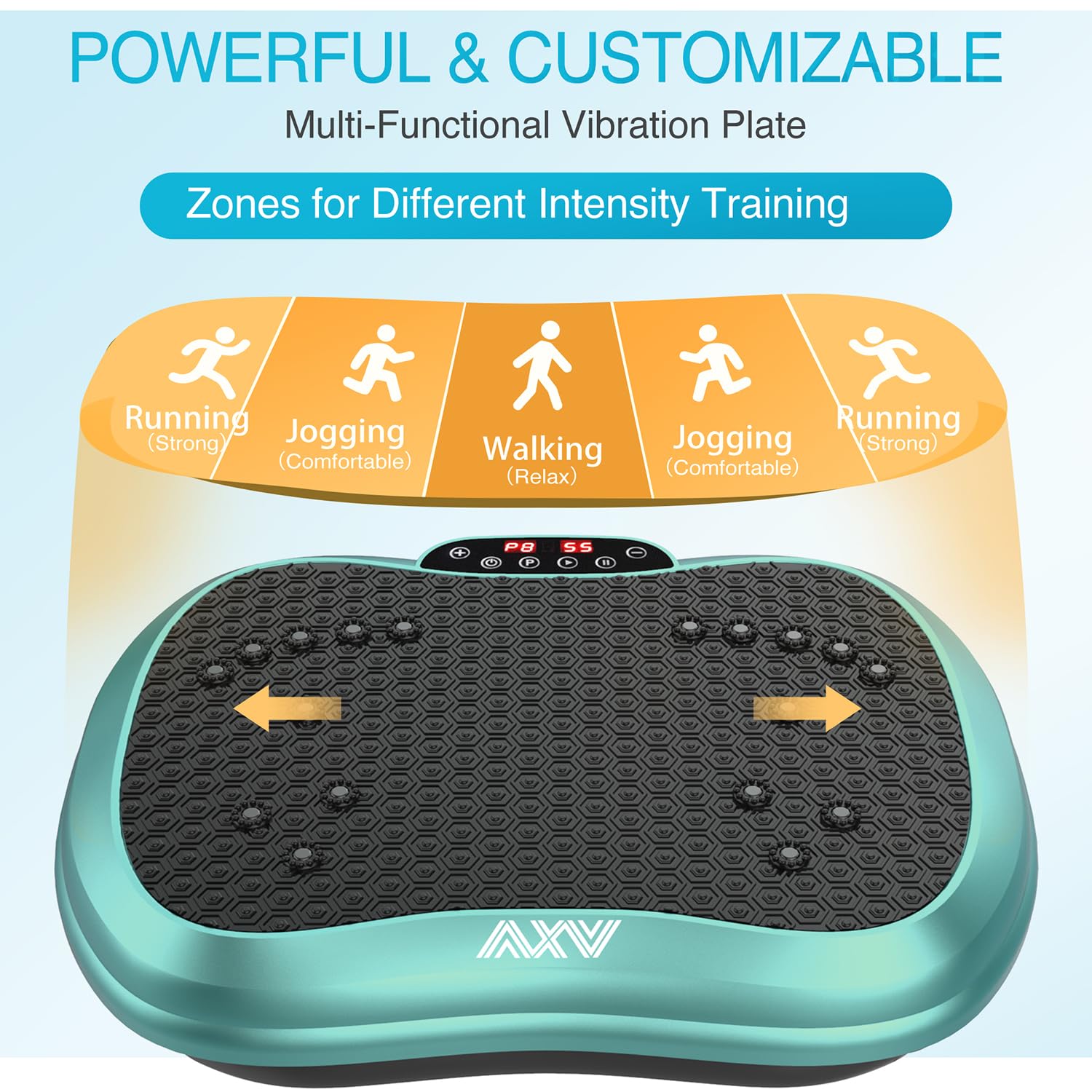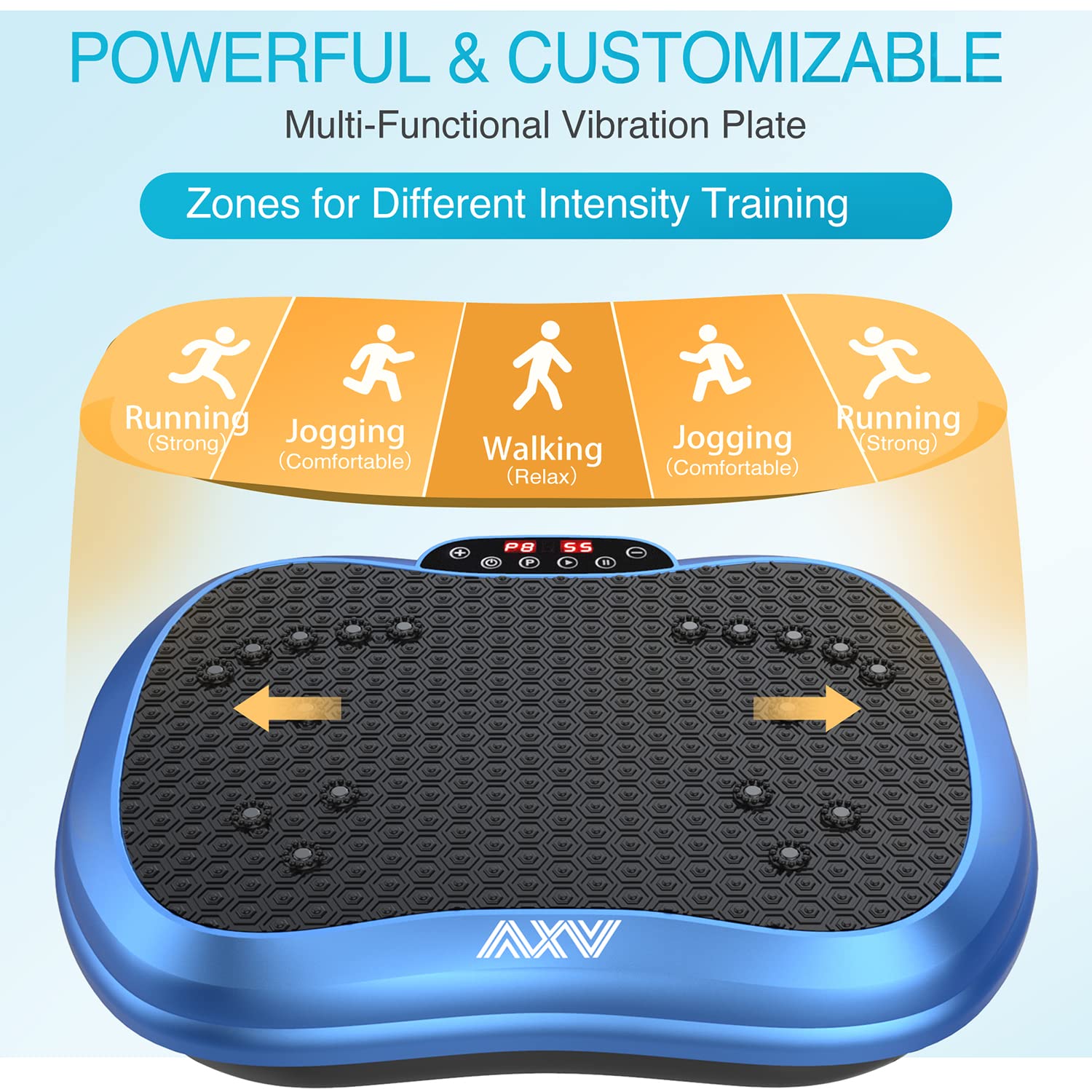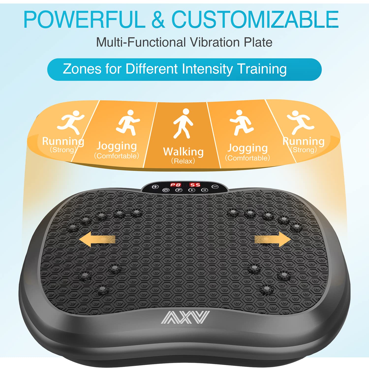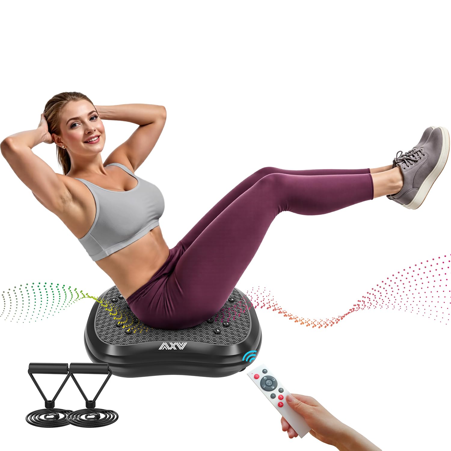 - ✅WHY WE CHOOSE AXV VIBRATION PLATE: Can be connected to phone via BT and used as BT speaker; Magnet health massage function; LED display shows time, speed and burnt fat making your workout visible; Compact size can be used anywhere & easy to carry and store; Anti-slip coating designed;Enhanced upgraded Ergonomic design shell ensures more durability and stability; Comes with Remote control ,Resistance Bands and detailed manual...everything you need.