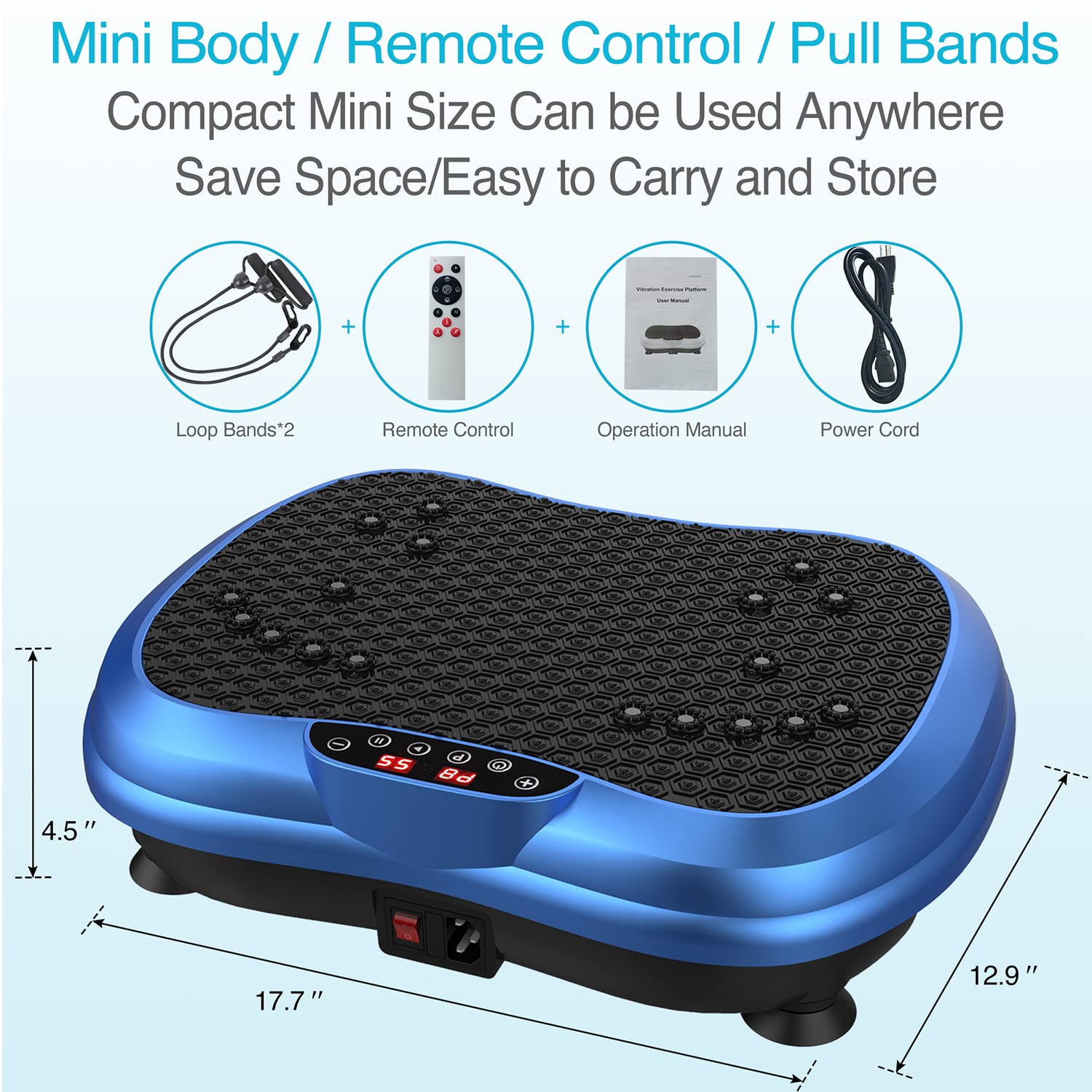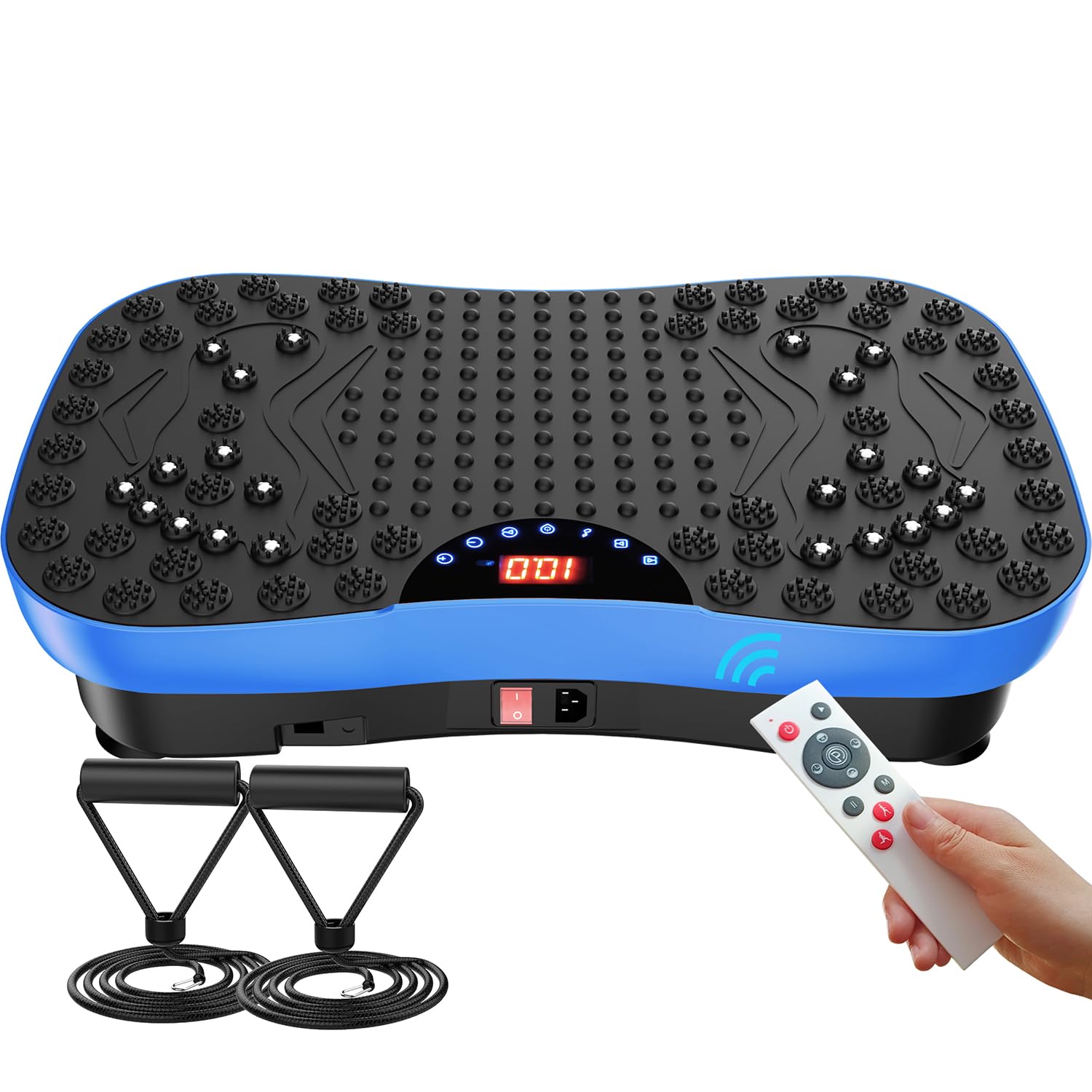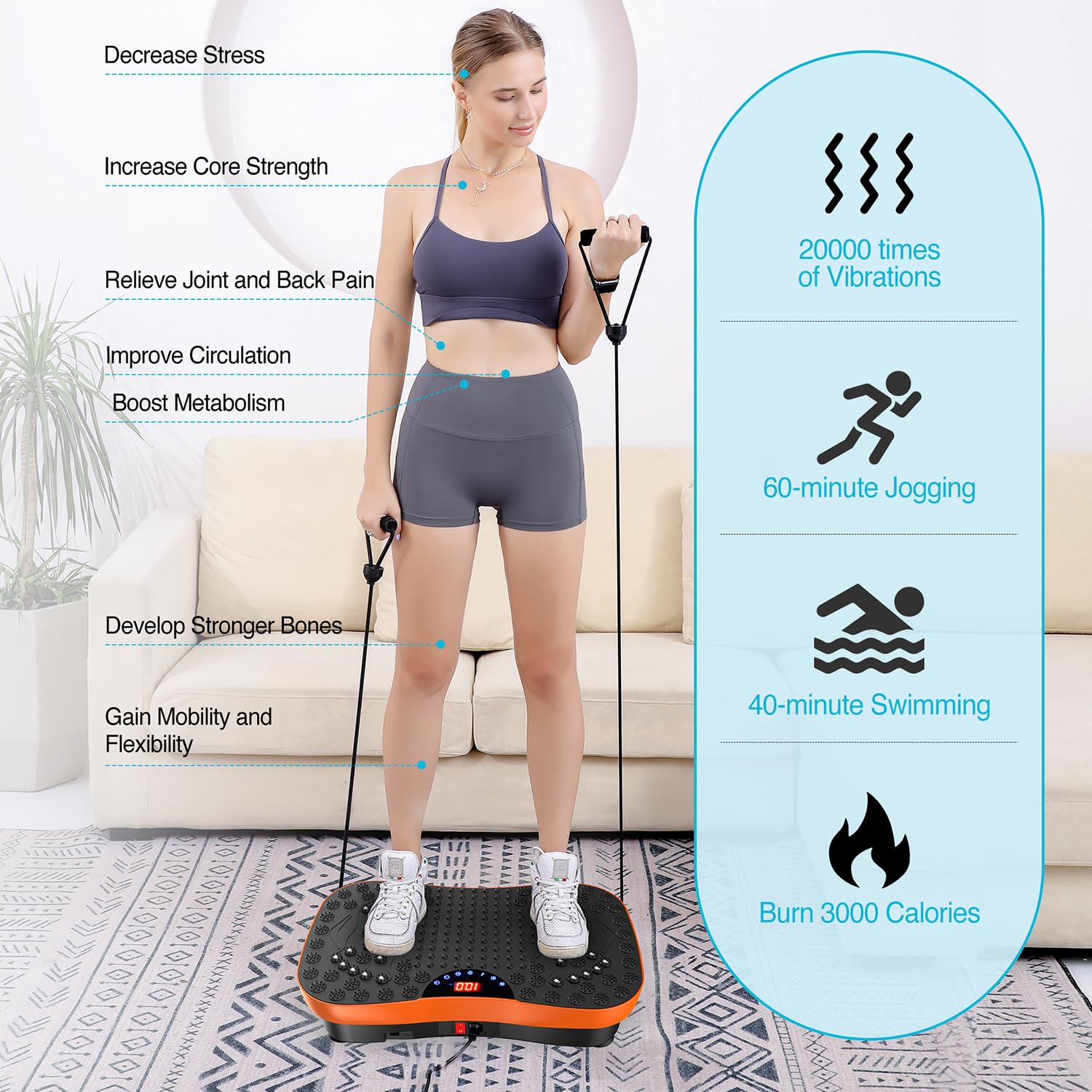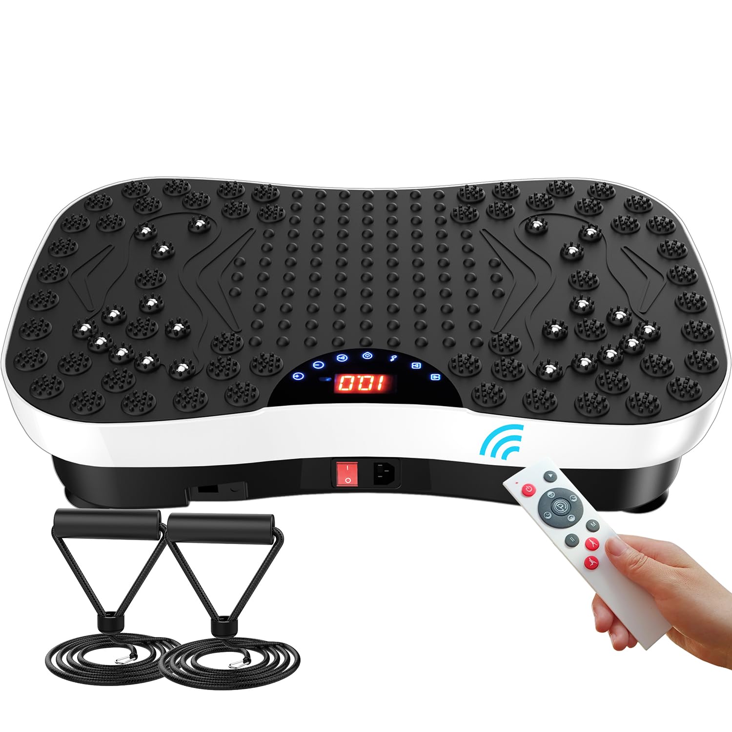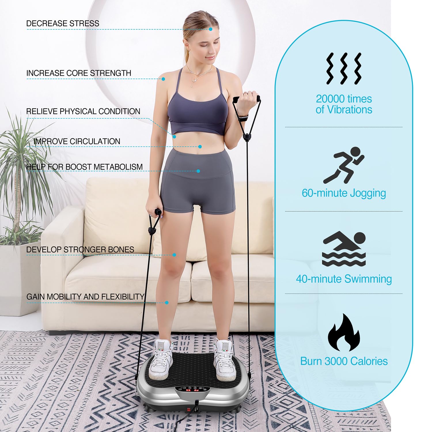 - ✅RICH FUNCTIONAL & HIGH EFFICIENT& REMOTE CONTROL: Adjustable vibration speed (1 to 120), with 2 resistance workout bands, can exercise upper body and lower body at the same time. Offering variety of exercise modes, allow you to try different vibration exercises, With this workout machine, you can have your routine exercise done in only 10 minutes everyday. What you’ll get is a better shape and enhanced metabolism, increased bone mineral density, relieve and reduce stress levels.