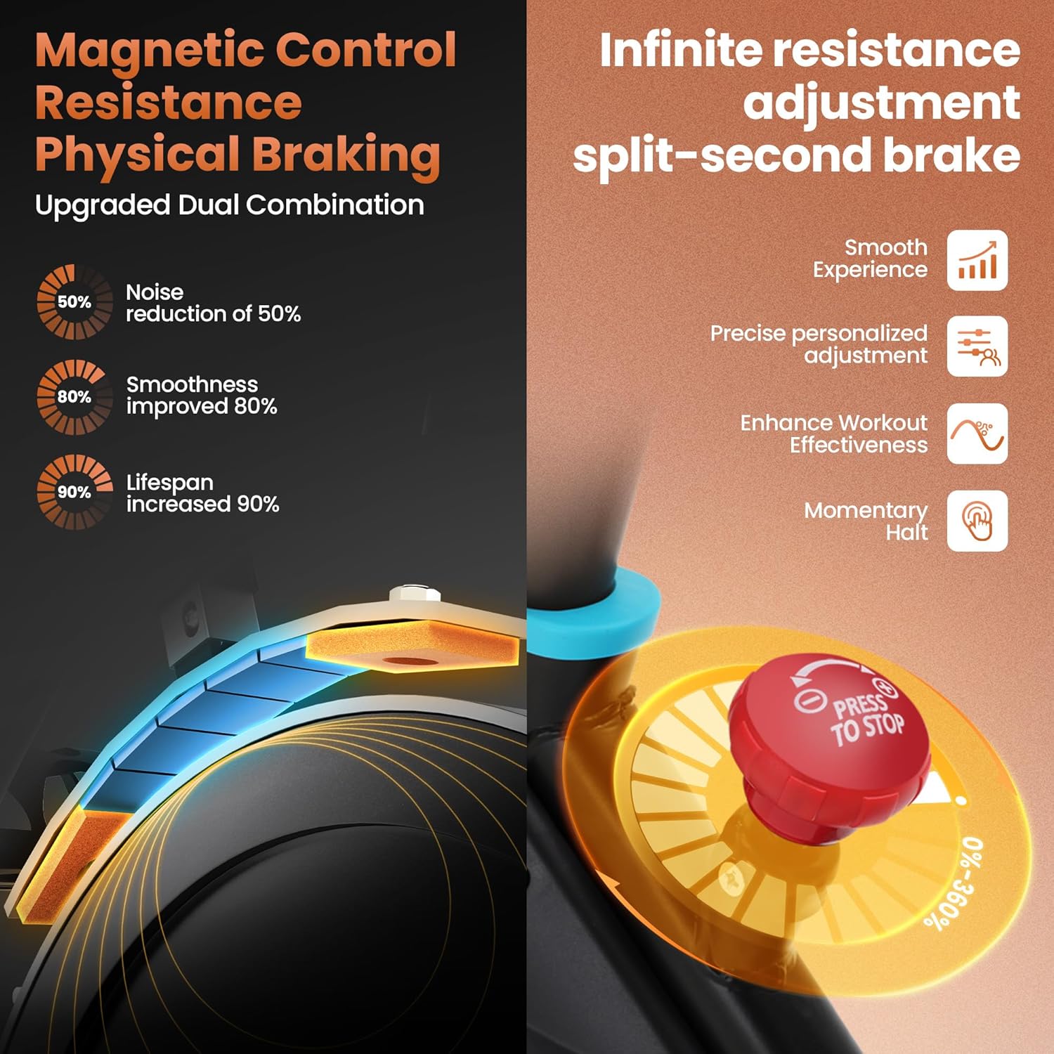 - 【Hyper-Quiet Belt Drive System】:Equipped with the latest technology in belt systems, this exercise bike operates smoothly and quietly,allows you to exercise without bothering others.By turning the resistance adjustment knob, you can set your own training plan according to different resistance levels, experiencing a real cycling feel. Pressing this button will quickly stop the exercise bike, ensuring safety