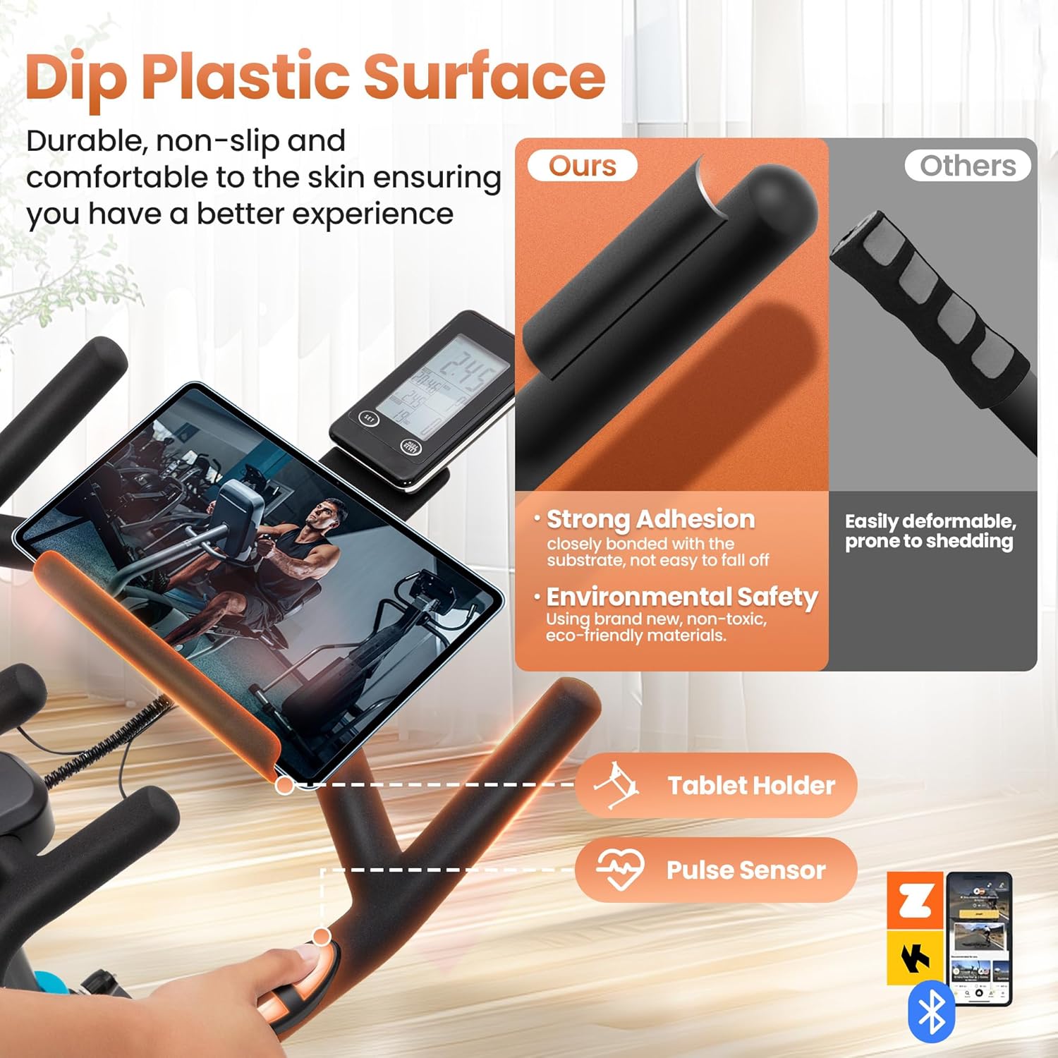 - 【Comfort & Safety】: Our exercise bike prioritizes comfort and safety with handlebar grips made from professional-grade materials, ensuring durability, non-slip grip, and a comfortable feel against your skin for an enhanced experience. The soft seat cushion provides exceptional comfort, featuring a hollow center design for excellent breathability. Designed for stability and durability, the exercise bike supports up to 350 lbs max weight