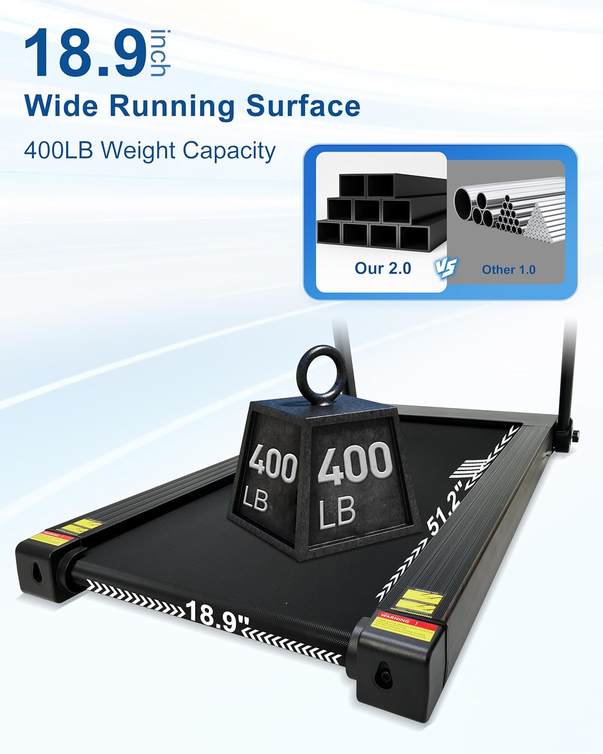 - 400 LB Capacity & 18.9 INCH Wide Belt: This heavy duty treadmill features a sturdy frame supporting up to 400 lbs. The 51" x 18.9" running surface provides ample space for various activities, ensuring comfort and stability for users of all sizes.