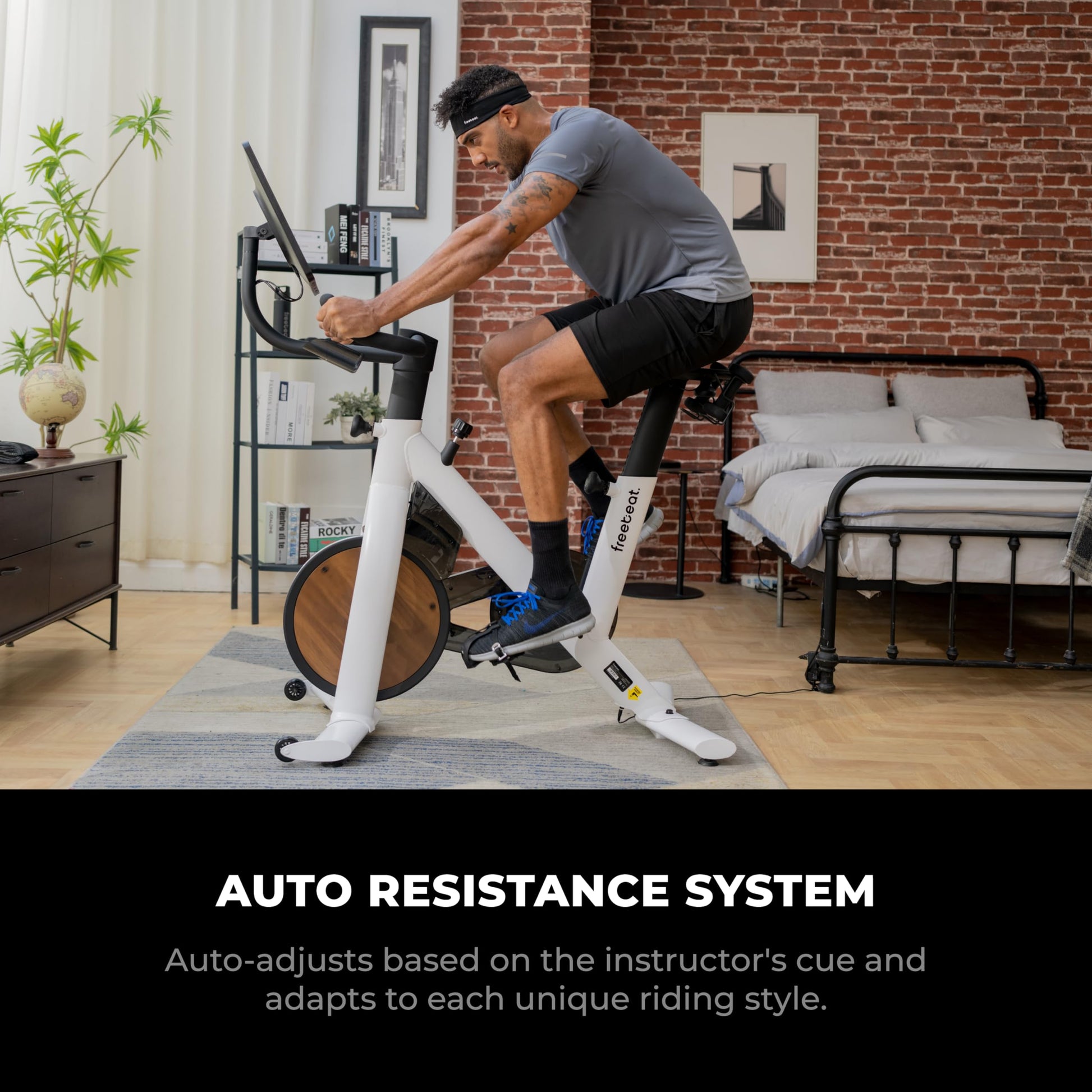- đ”ăAUTO RESISTANCE SYSTEMăThis Indoor Cycling Bike automatically adjusts resistance level based on the instructor's cue while riding and adapts to each unique riding style.