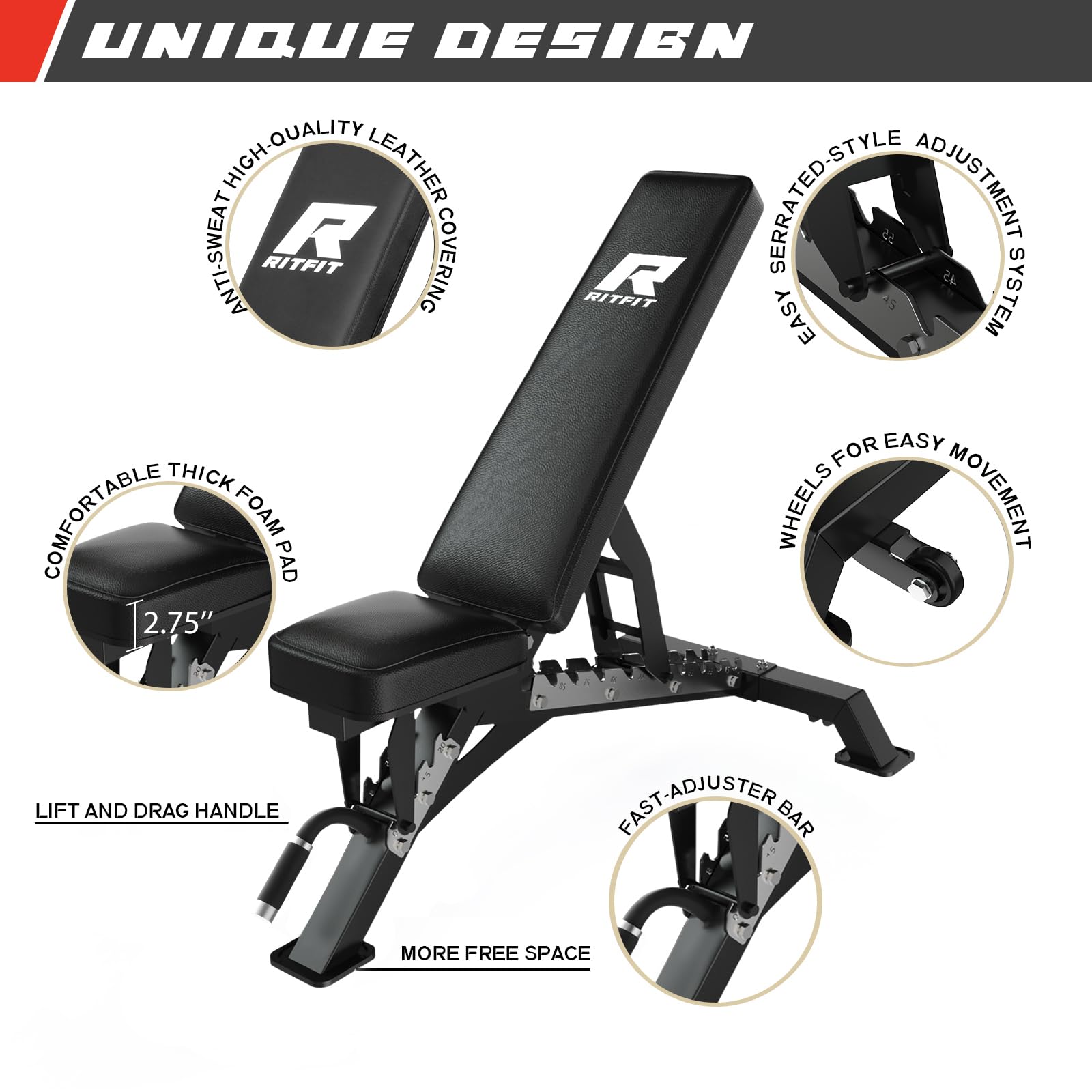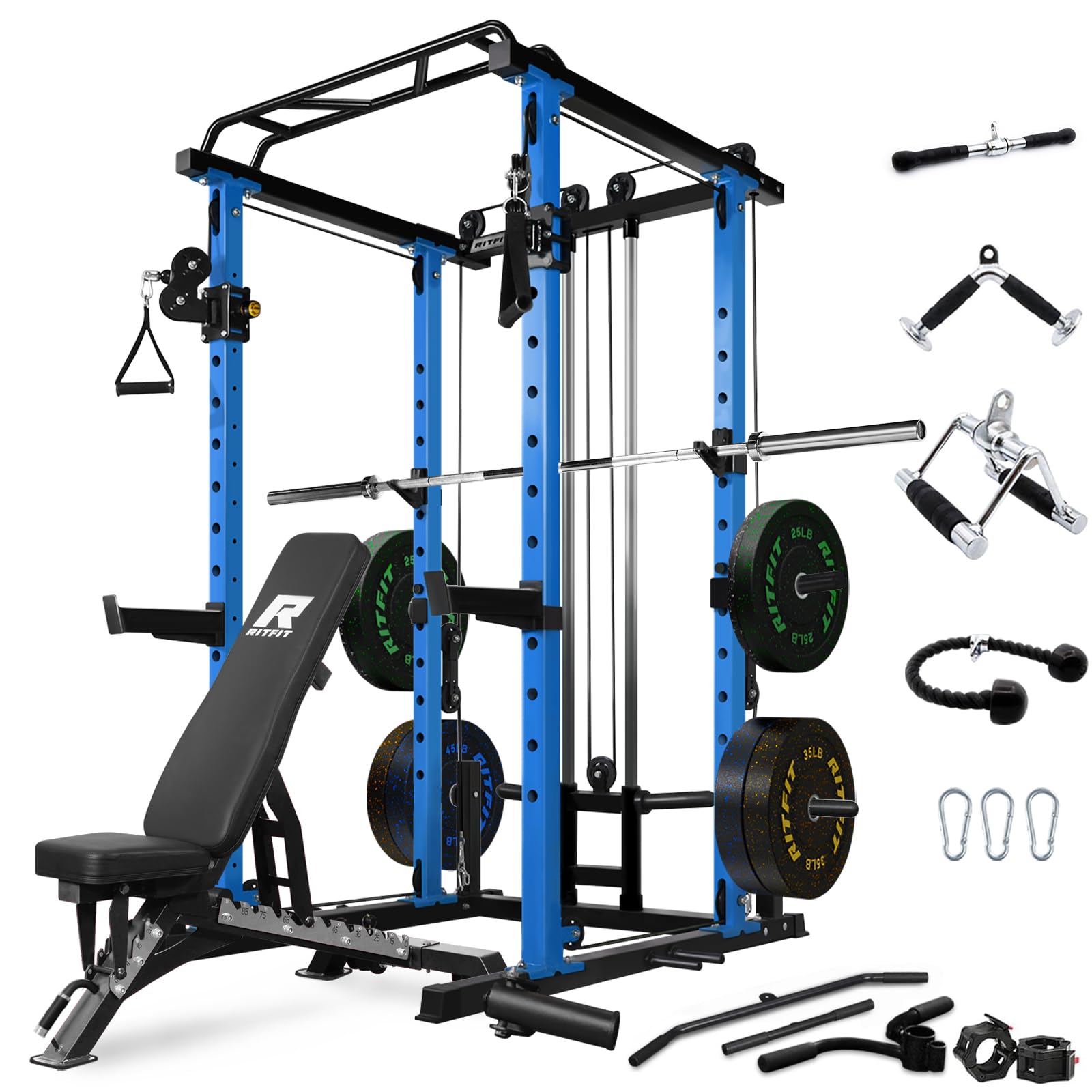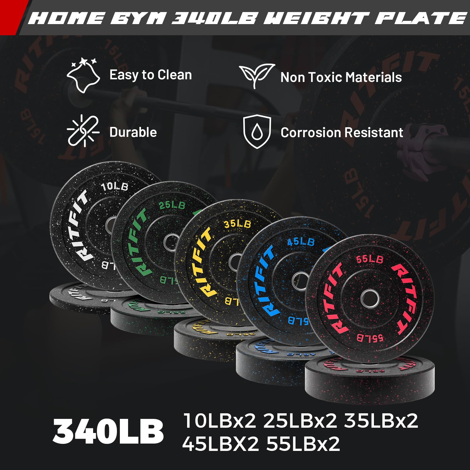 - A Sturdy Home Gym Station - The Home Gym System is made with a heavy-duty steel frame which guarantees a stable structure and long-lasting use. The RitFit PPC03(PC-410CC) Power Cage is 1000 lbs rated with size 44″W x 57.4″L X 85″H. The weight bench is adjustable with a high weight capacity of 1300lbs. The 7 Feet Olympic Barbell Bars with 900lbs weight capacity and the Bumper plates are built to the highest standard and offer safe weight lifting.