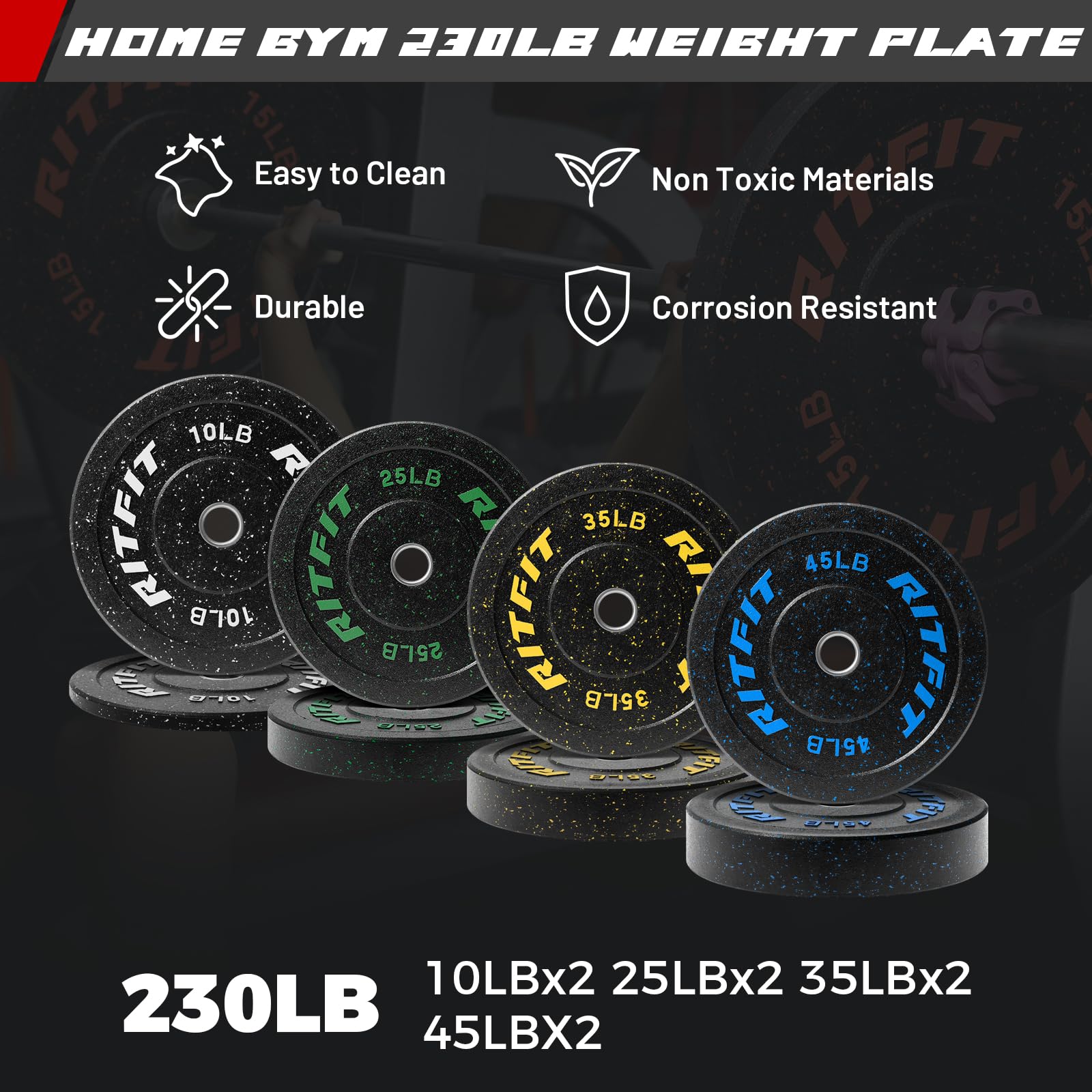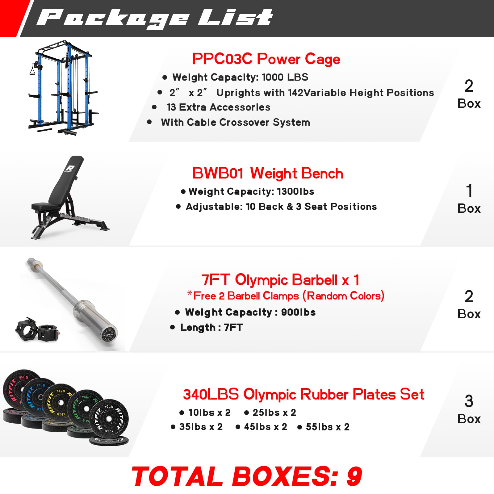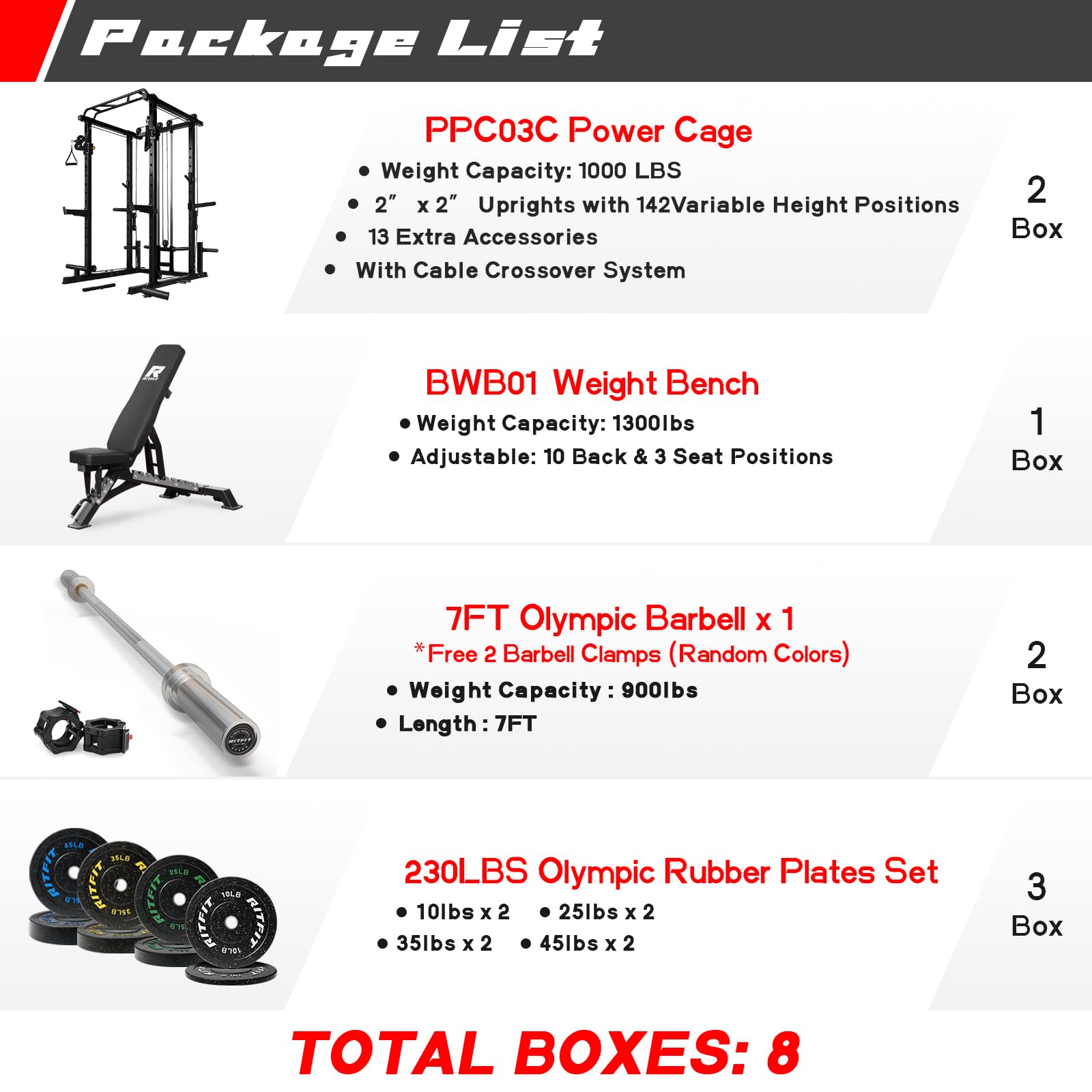- What's in the package - RitFit PPC03(PC-410CC) Power Cage with Cable Crossover System *1; RitFit Adjustable Weight Bench *1; RitFit 2 inch Olympic Barbell *1; RitFit 230LBS Olympic Bumper Plates Set (10lbs *2, 25lbs *2, 35lbs *2, 45lbs *2); Free Collars *2