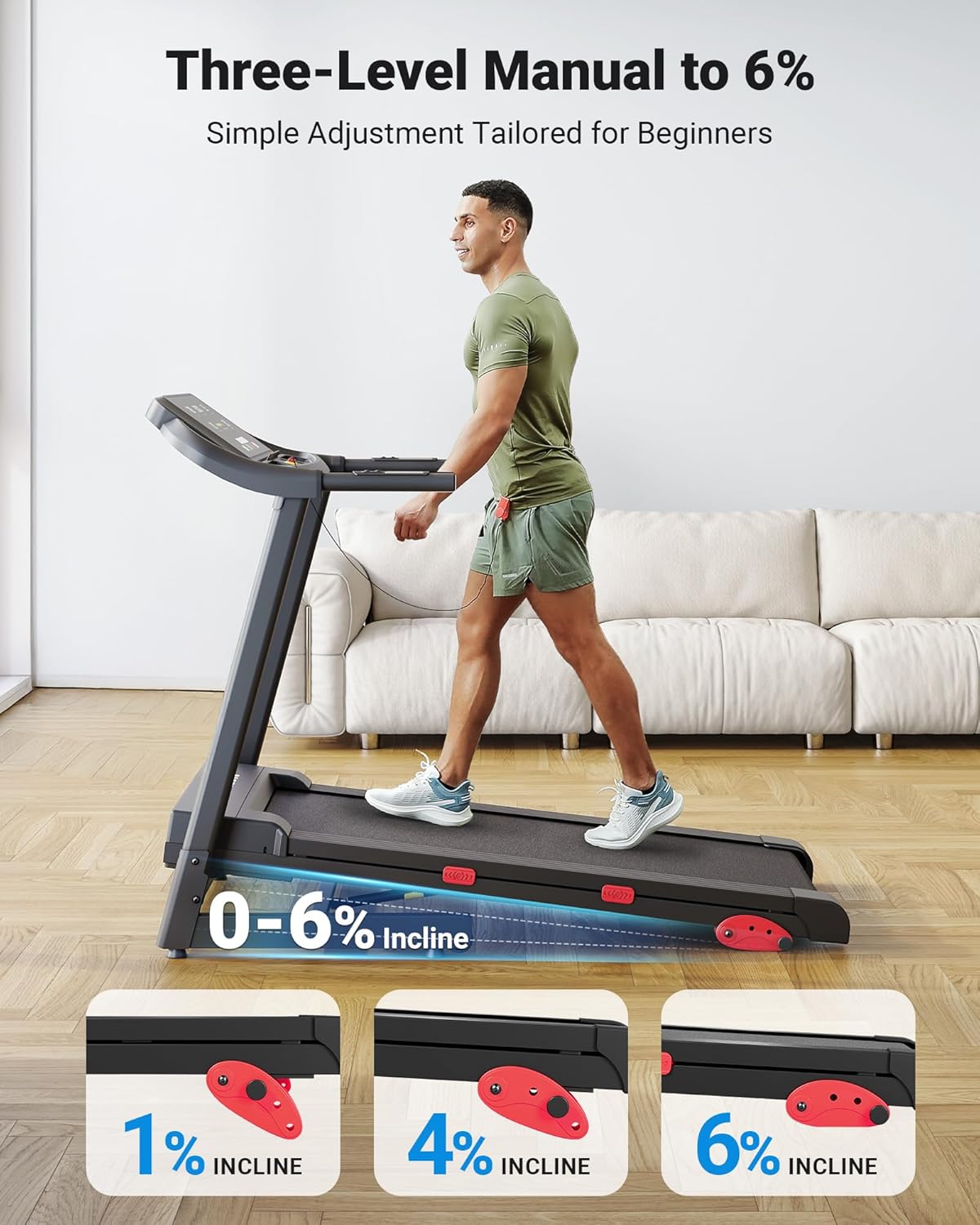 - [TREADMILL WITH 3 ADJUST INCLINE] 0-6% incline range allow you to customize your workout intensity, The foldable treadmill with incline helps you target more muscle groups to train your body to simulate uphill running