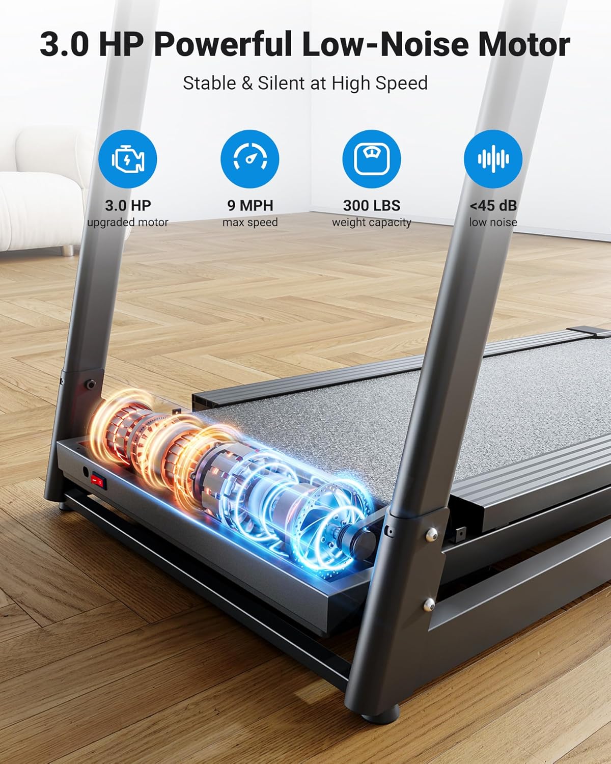 - [9.0 MPH POWERFUL MOTOR] THERUN treadmill for home features a quiet 3.0 HP motor that reaches speeds of up to 0.5-9.0 MPH. Discovering the versatility of speeds and maintaining a low noise level of just 55 dB, ensuring a quiet workout environment. This incline treadmill 300 lbs capacity supports a quiet workout environment for you, your family and even your pets