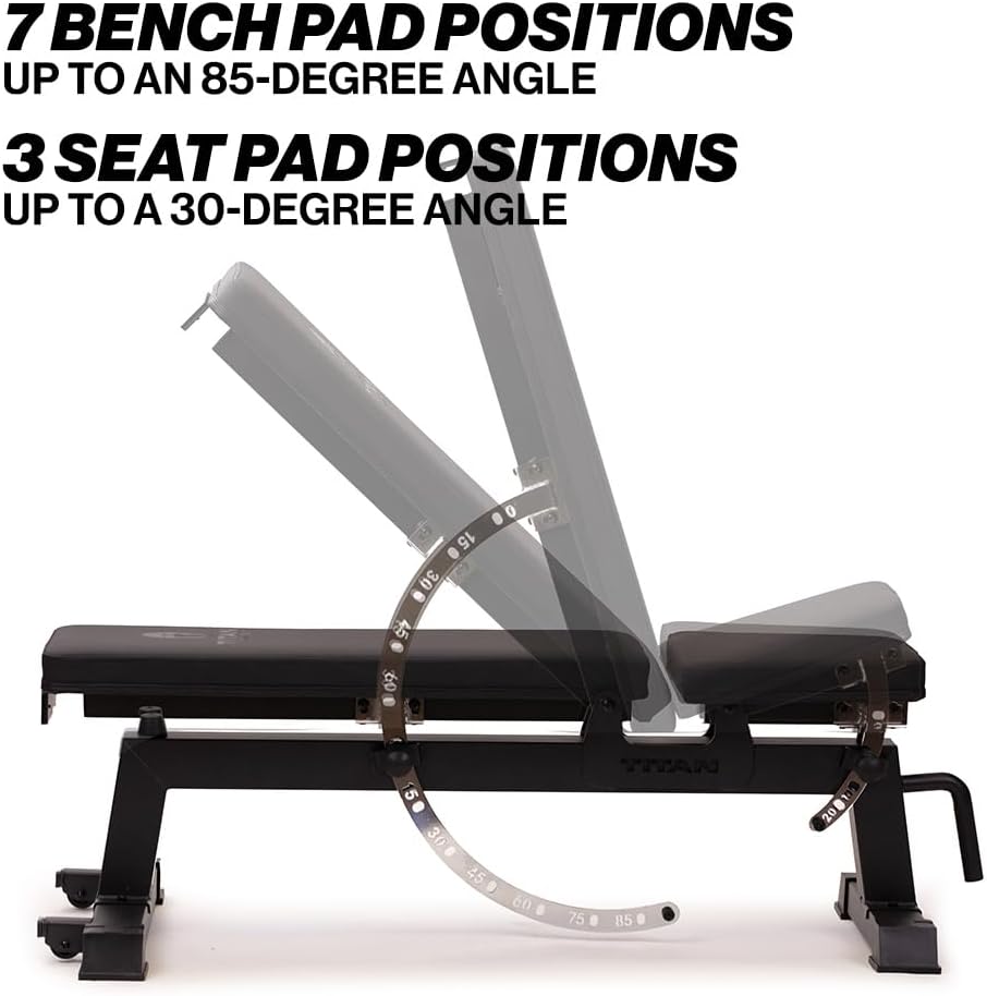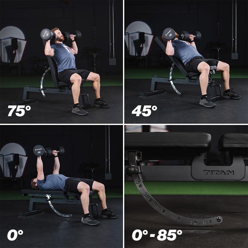- ADJUSTABLE BACK AND SEAT: This utility bench adjusts from flat back to incline, to an 85-degree upright position for versatile free-weight exercises with barbells or dumbbells, including bench presses, pullovers, rows, tricep extensions, and curls.