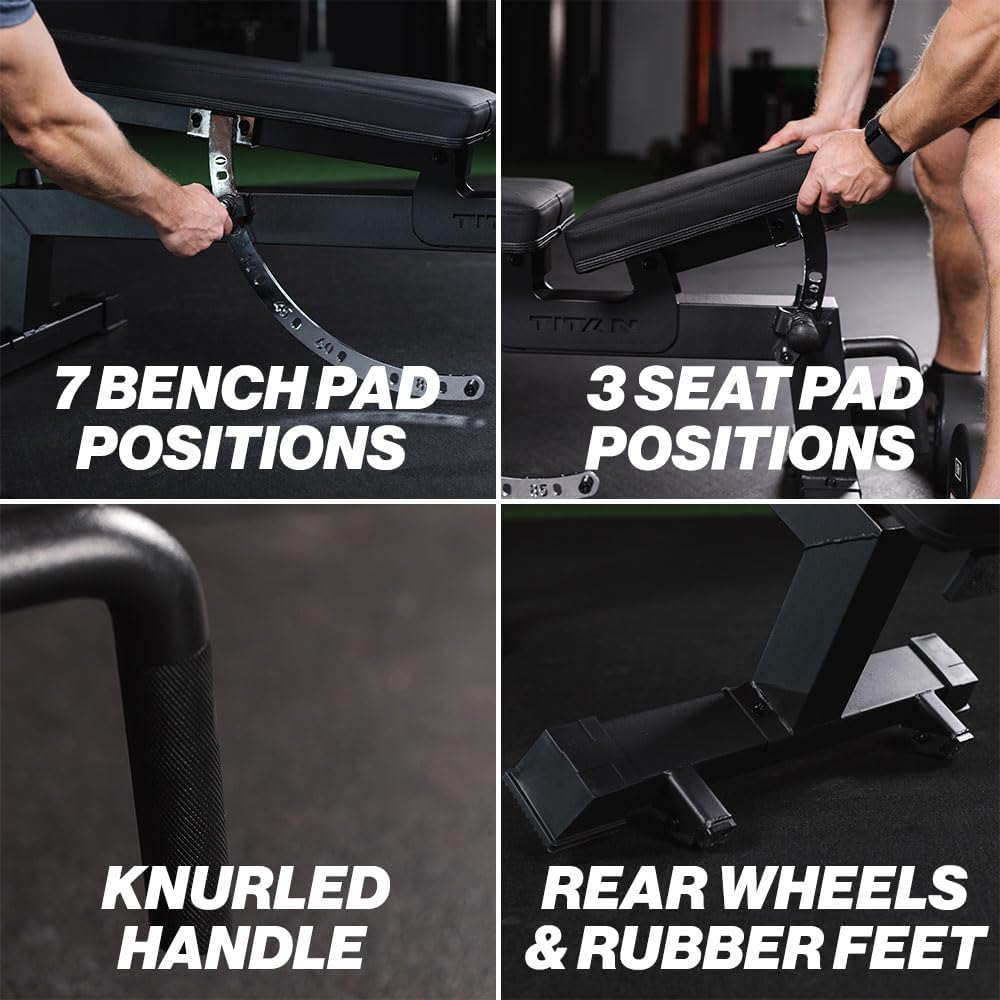 - EASY TO TRANSPORT: This space-efficient gym bench is perfect for any room, featuring sturdy transport wheels and a handle for effortless grip and mobility.