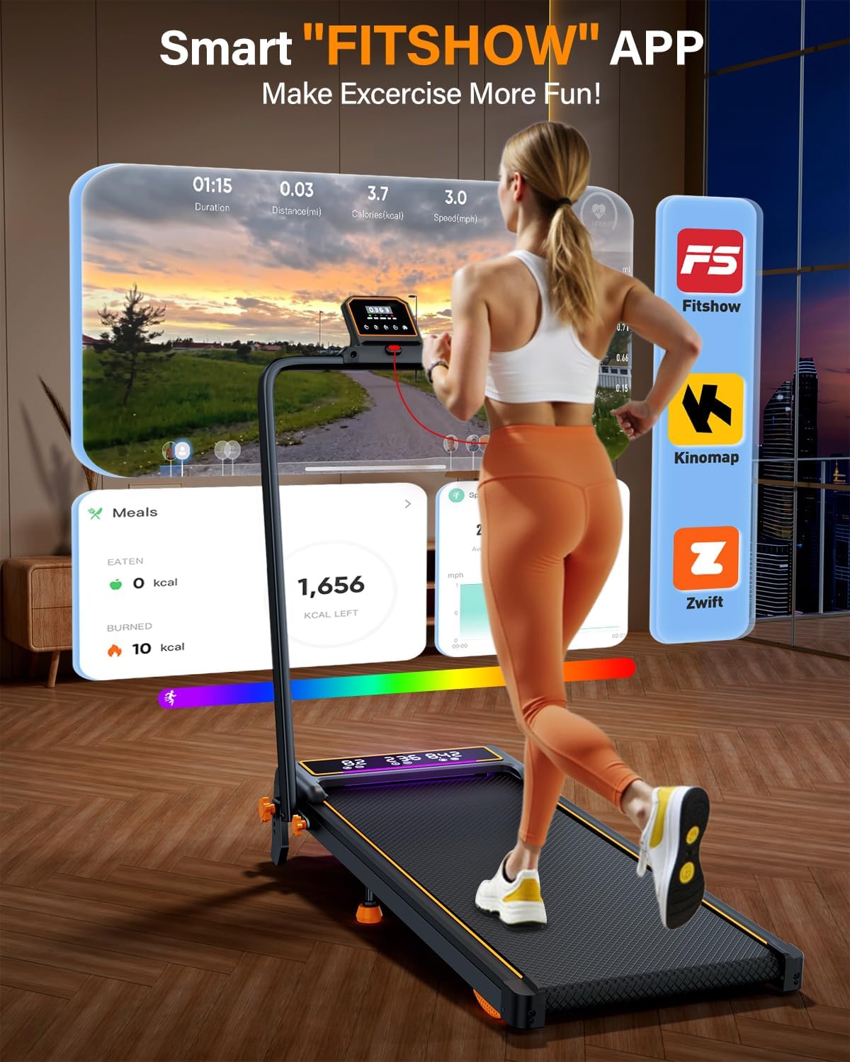- 🏃♂️【Elevate Your Workout with Stunning RGB Lights】This walking pad treadmill features dynamic RGB light strips that change colors based on your speed, creating an immersive, high-energy atmosphere. Each speed setting is accompanied by a unique color, adding a fun and motivating touch to your fitness routine. Perfect for those who love vibrant, customizable lighting. Transform your run into a colorful experience that matches your pace and style!