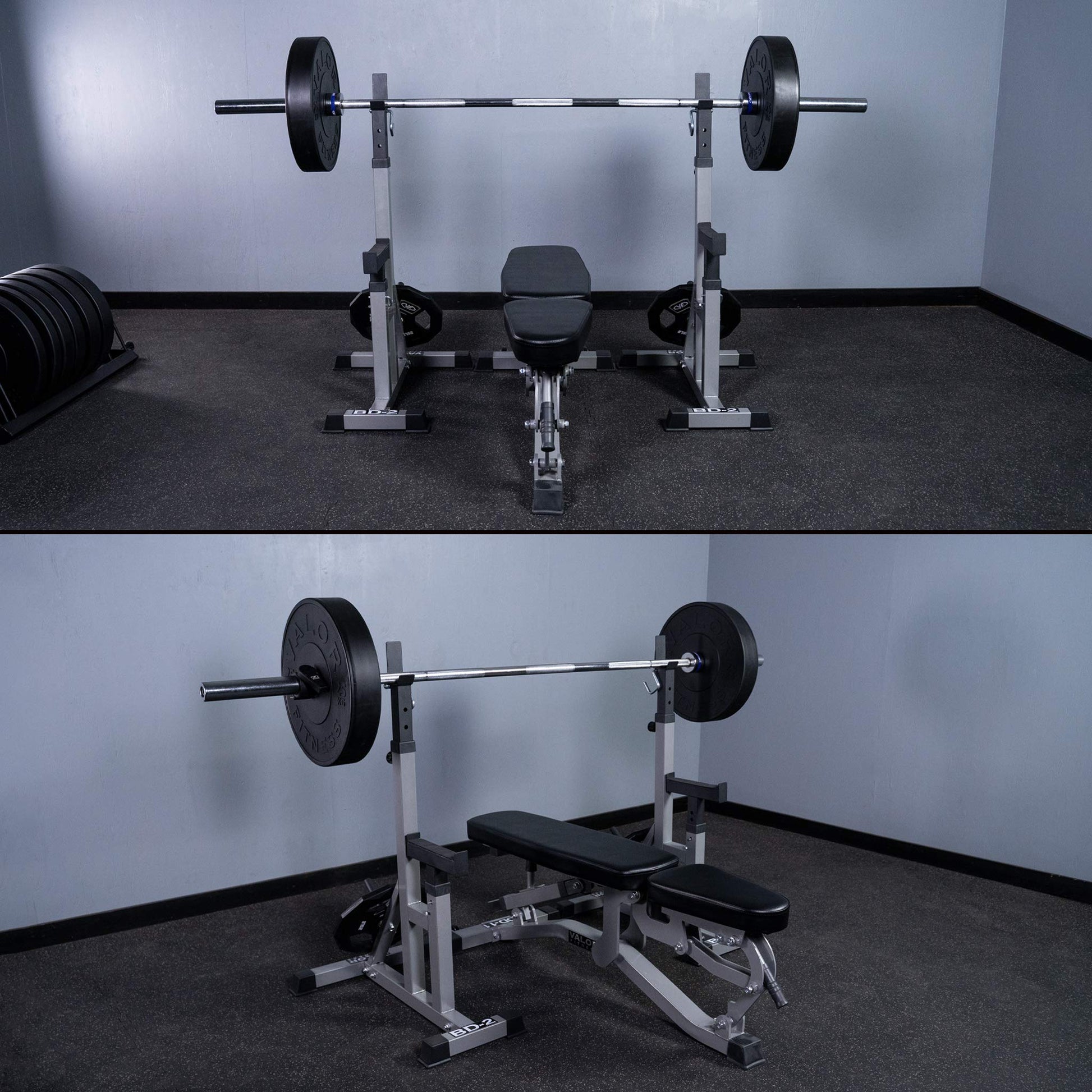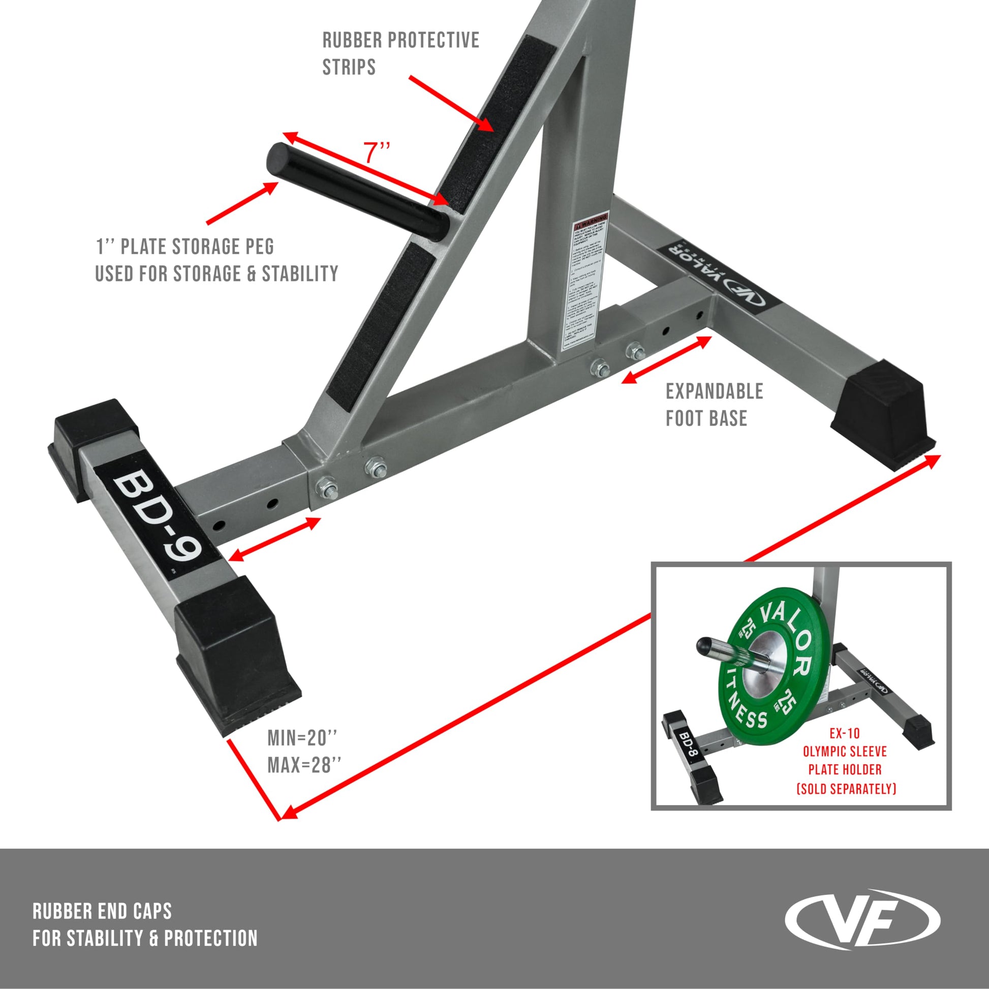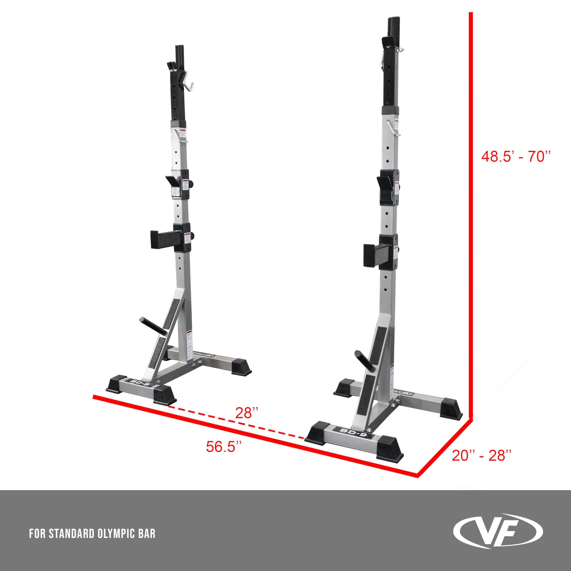 - ADDITIONAL- 7” plate storage pegs allow for a clean and organized home gym. Designed specifically for bench press function. To accommodate standard Olympic barbell, stands should be placed 27.5” inches apart to bring total width of footprint to 56.5”