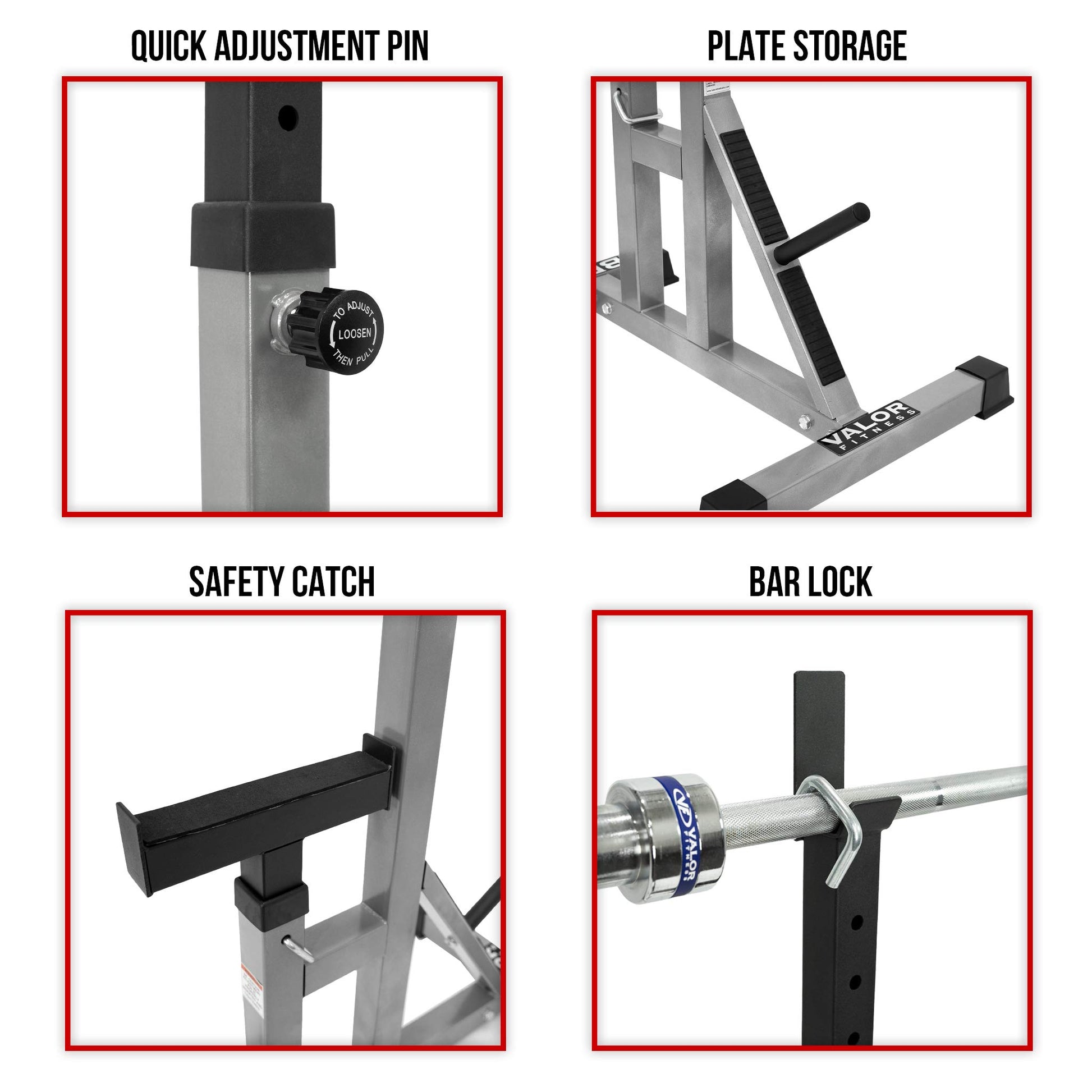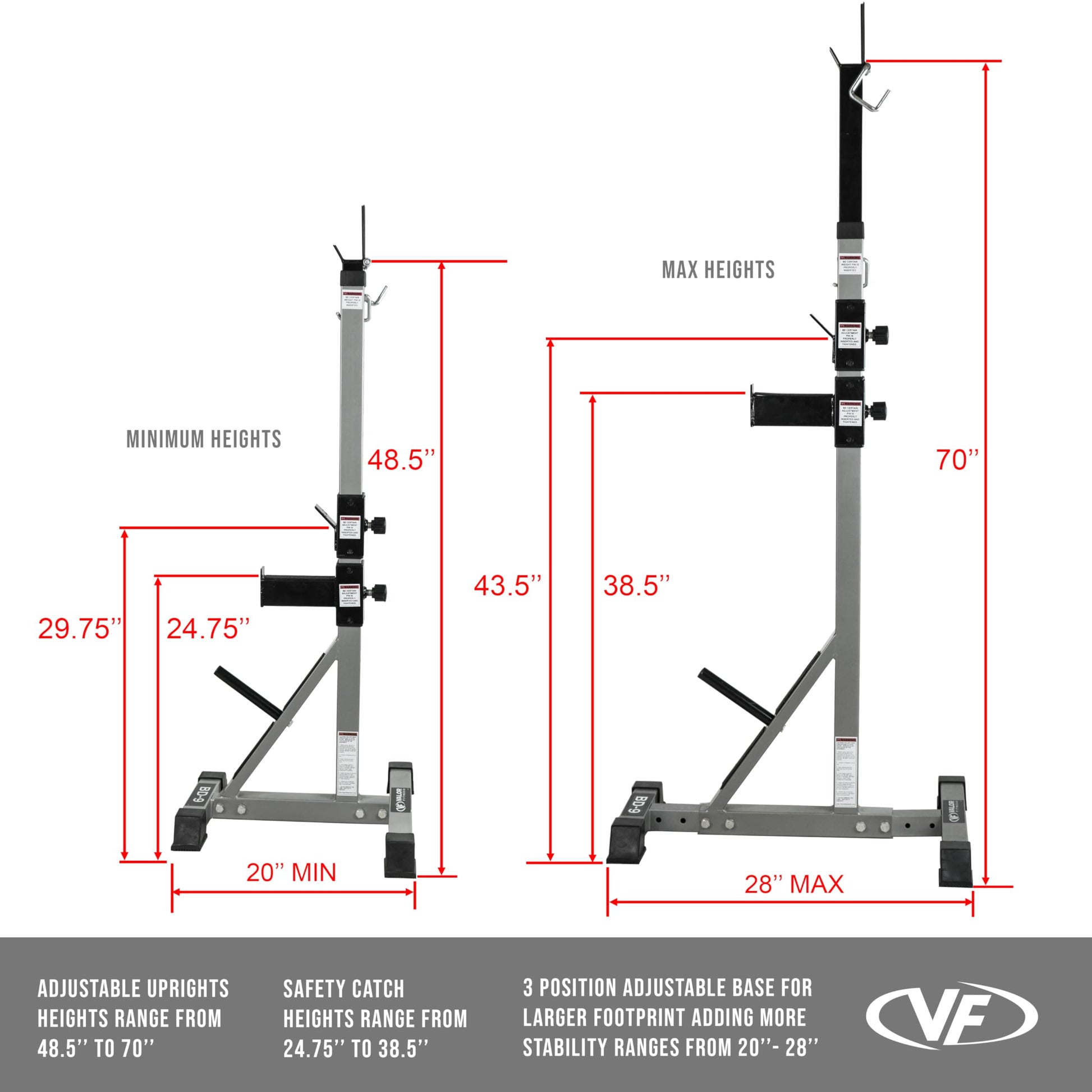 - ADJUSTABLE- 9 adjustable positions for uprights, 16” range of adjustments (adjusts with popper pin). 12 adjustable positions for safety catch, 11” range of adjustments (adjusts with locking pin). Height of unit ranges from 33.75” to 49.5”
