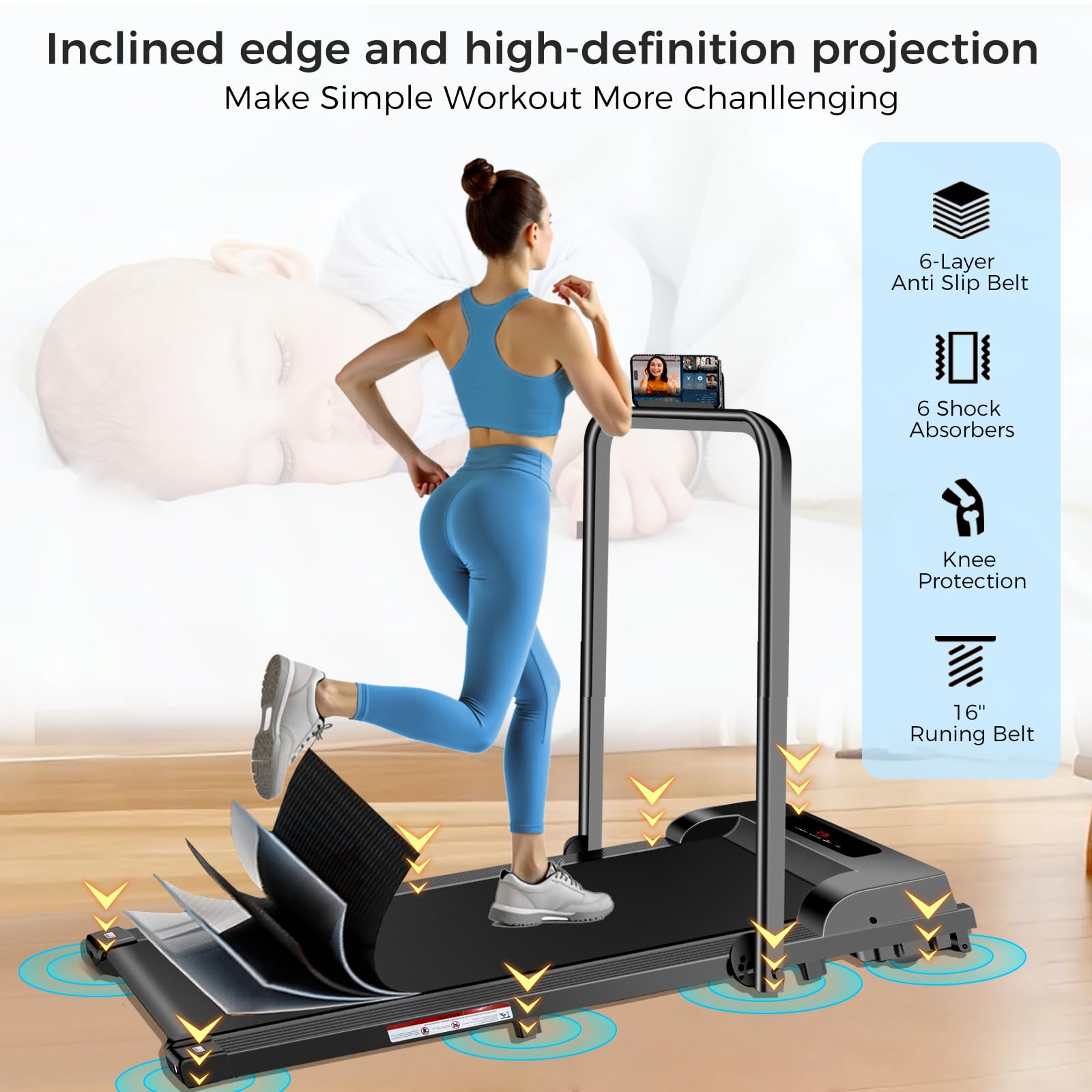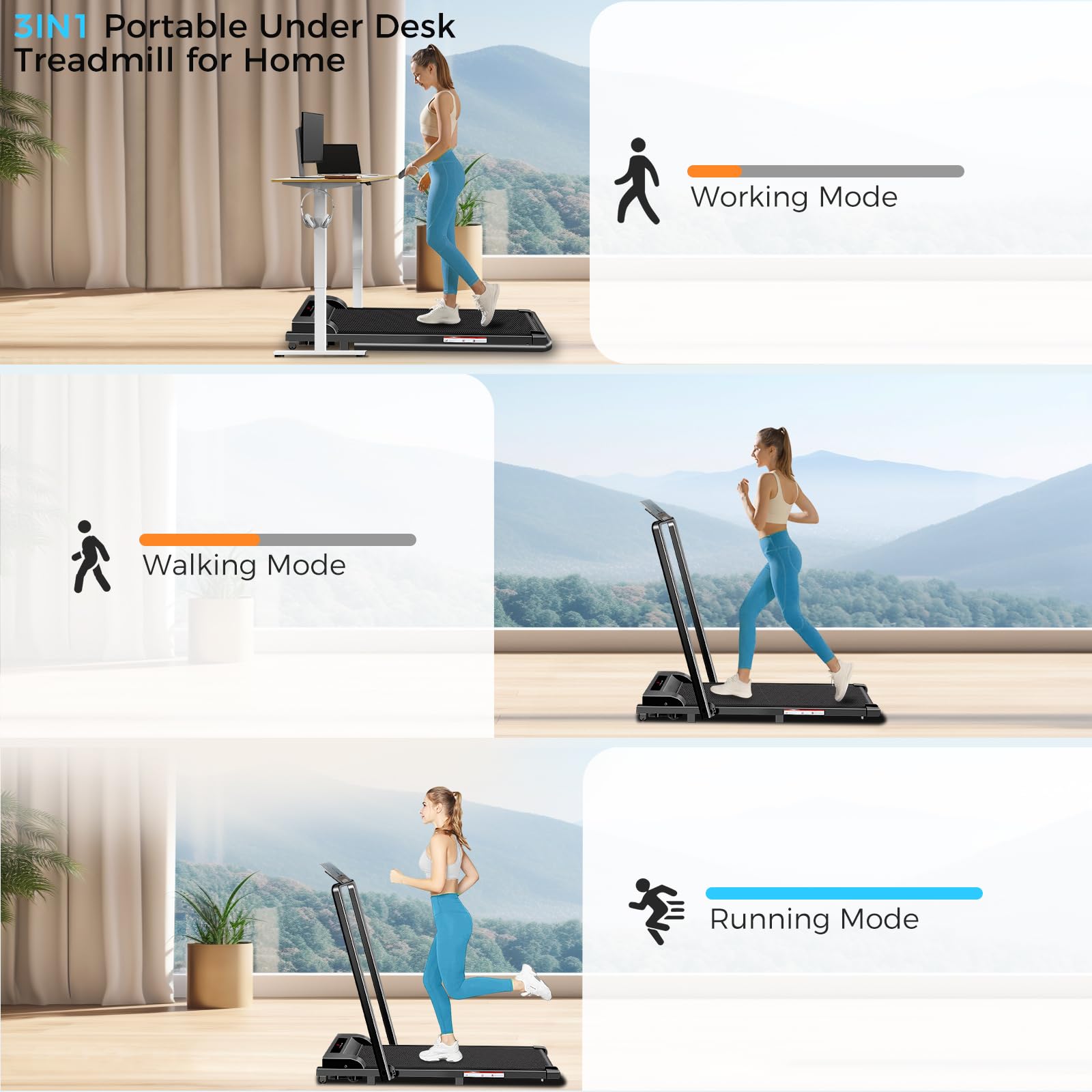 - 【3-in-1 Under Desk Treadmill】Our under desk treadmill offers a speed range of 0.6-6.0MPH. After the hand rail is folded, it can be used as a under desk treadmill to walk and jog while you are working to exercise your body,0.6-2 MPH Leisure Mode,0.6-3 MPH Walking Mode,When the hand rail is raised, 3-6 MPH Running Mode.
