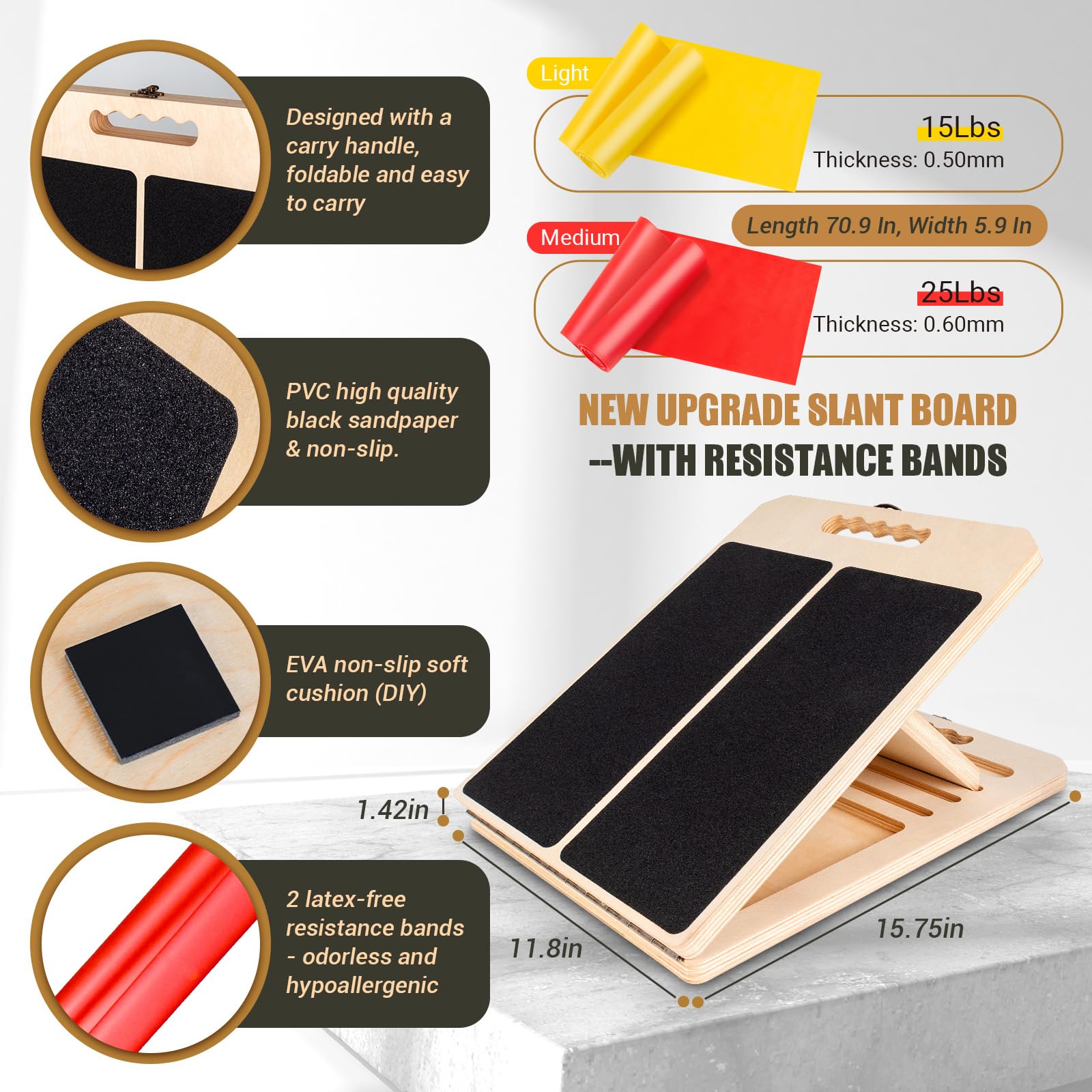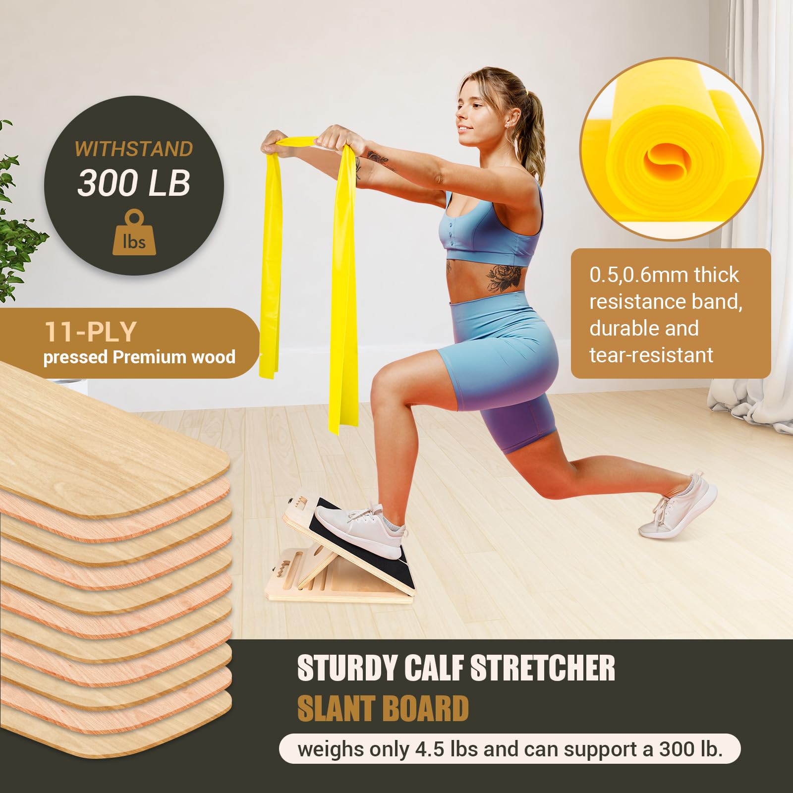- [Newly Upgrade Slant Board] This Physical Therapy Leg Exerciser is made of 11 layers of AA-grade poplar wood core and weighs only 4.5 pounds. Upgraded screws support up to 300 lbs adult standing. The non-slip EVA base & PVC sandpaper surface prevents slipping during calf stretching or squatting. In addition, it is equipped with two SGS-certified TPE materials, non-toxic, latex-free physical therapy bands to meet more training needs.