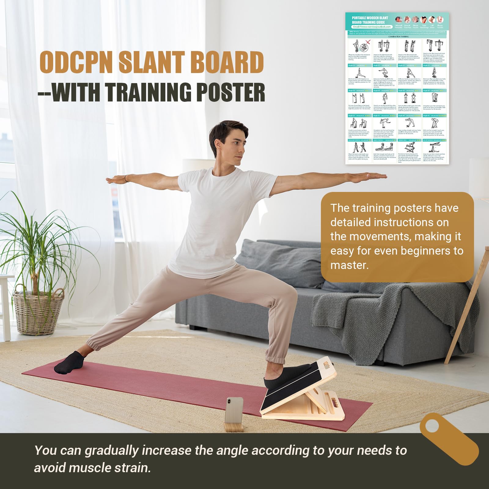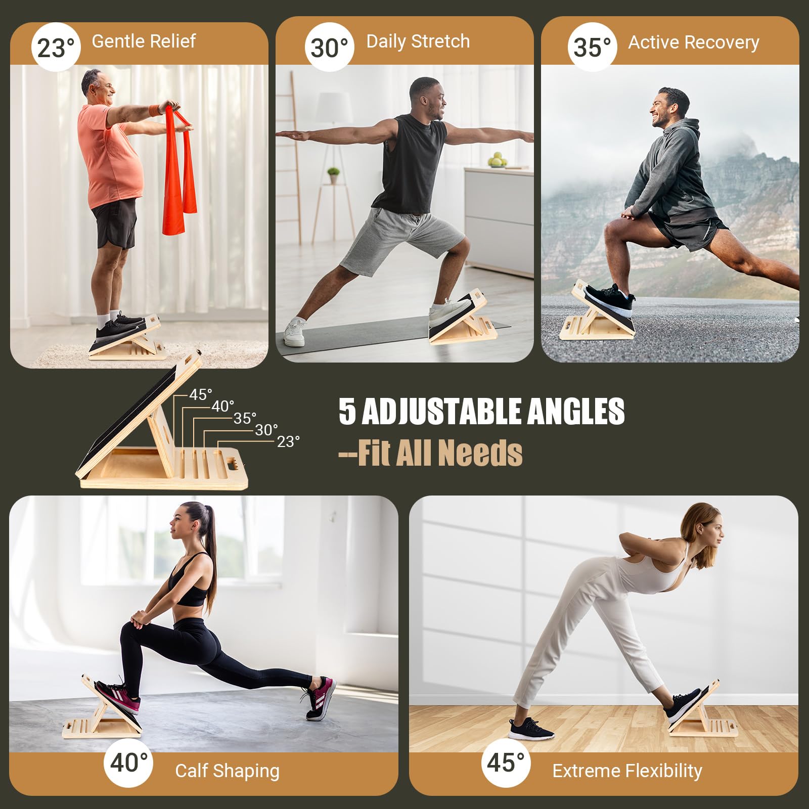 - [5 Adjustable Angles Wooden Slant Board] The adjustable slant board measures 11.77" D x 15.55" W x 1.38" H adjustable to 5 angles: 23°, 30°, 35°, 40°, 45°. You can choose different levels of calf stretching from easy to hard. The calf stretcher slant board is suitable for beginners and experienced exercisers and all body types to add variety and challenge to a workout programme.